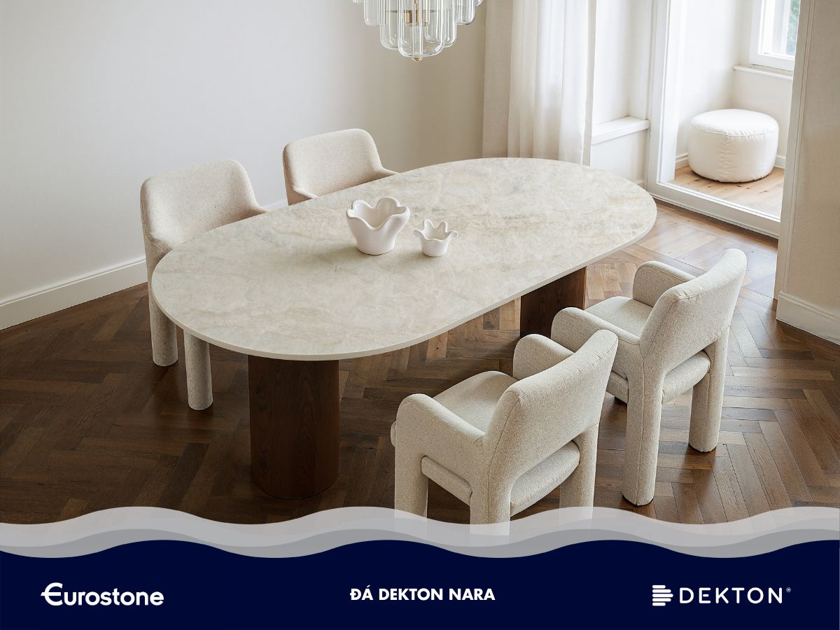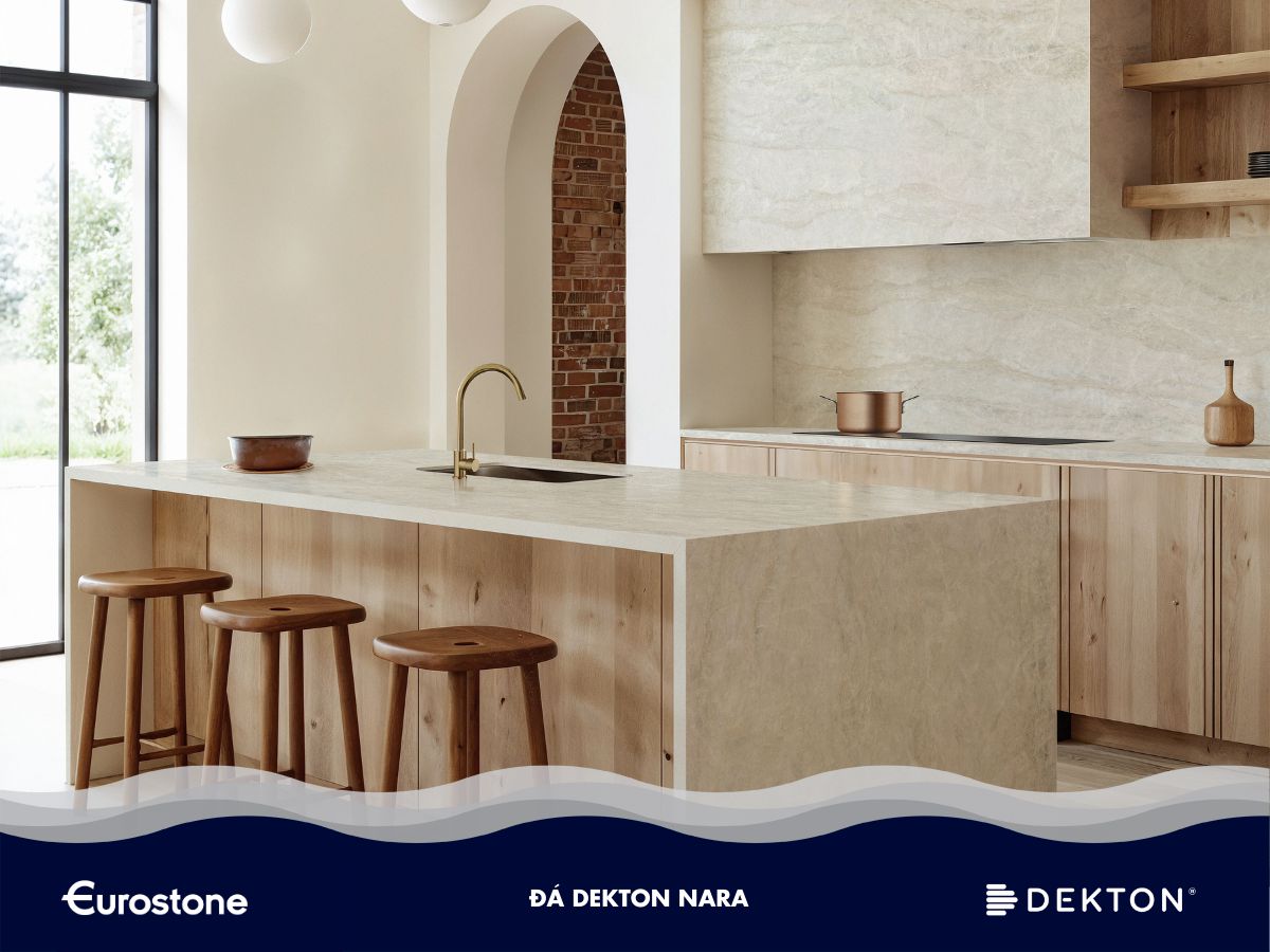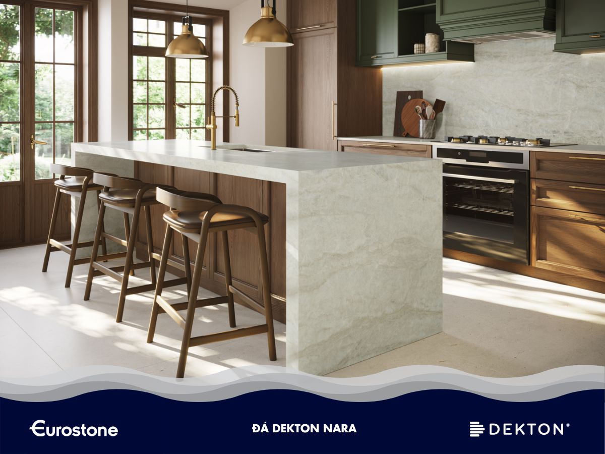 Đá Dekton Nara là dòng đá siêu nén cao cấp thuộc thương hiệu Dekton® thiết kế mang hơi thở hiện đại nhưng vẫn gợi nhắc vẻ đẹp cổ điển của đá thạch anh Taj Mahal – sang trọng, ấm áp và đầy chiều sâu.